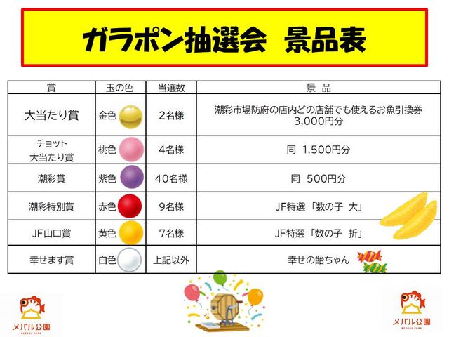 ≪参加要領≫ 潮彩市場防府内の全店舗のレシート1,000円で1回抽選