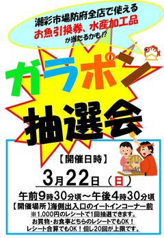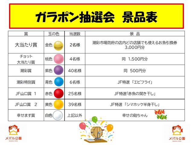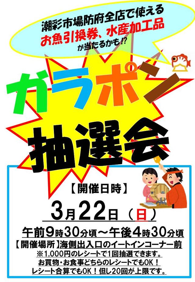 この日曜日は潮彩市場防府で、お買物、お食事をなさって、是非「ガラポン抽選会」にご参加ください。皆様のお越しを心からお待ちしております。