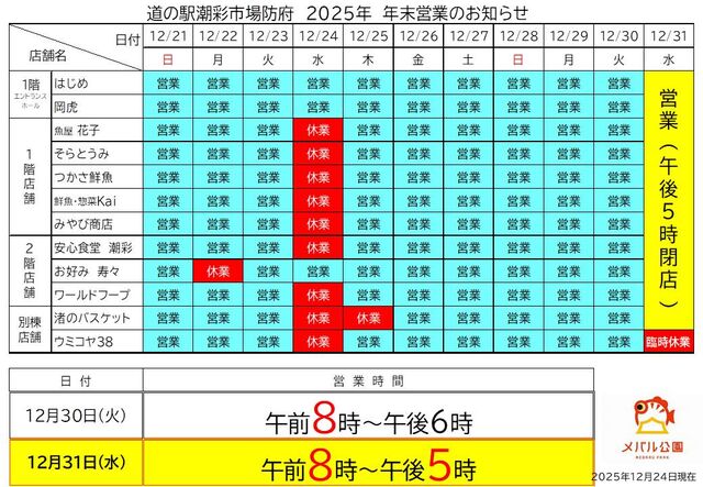 年末営業案内(12月24日現在)